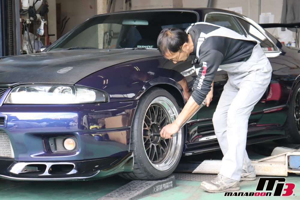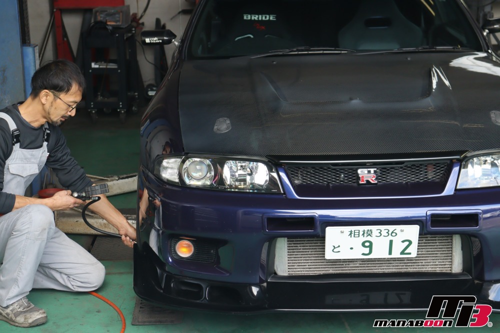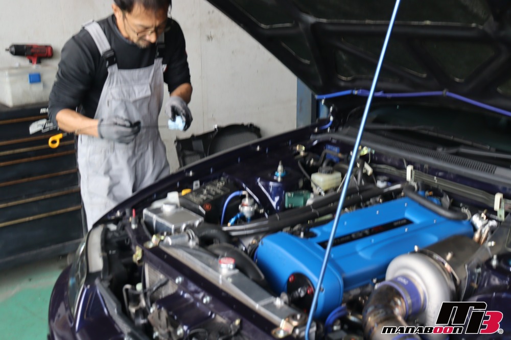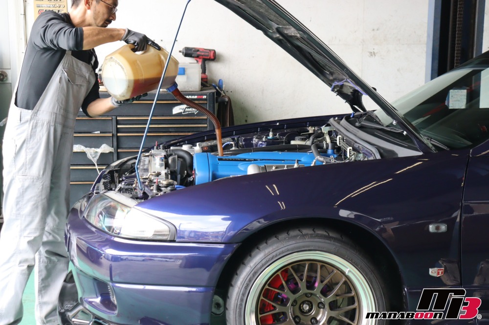 本日は、当社のデモカーBCNR33のオイル交換をします。