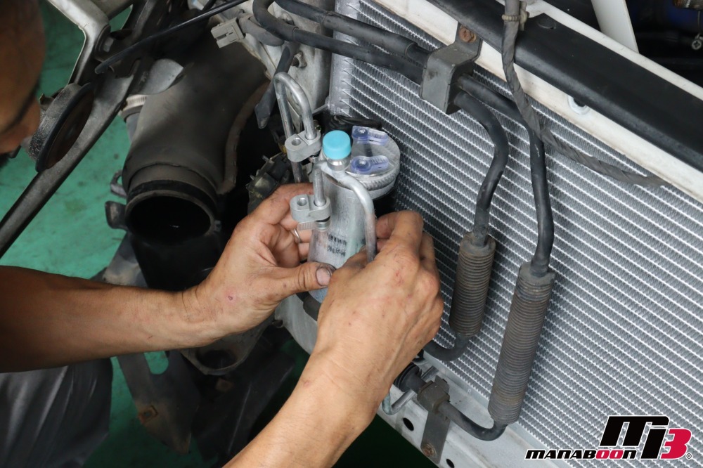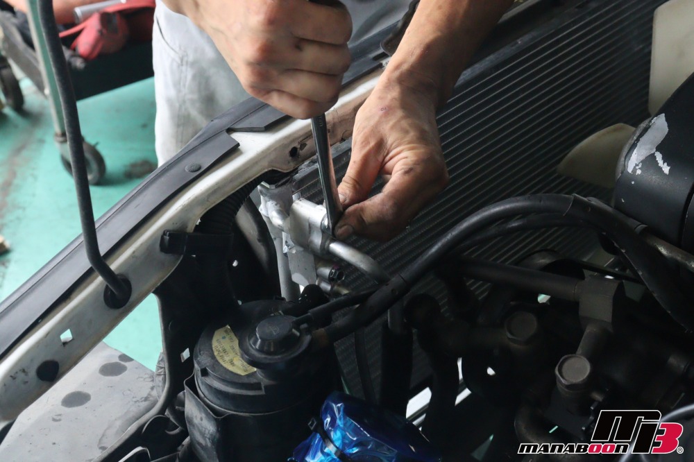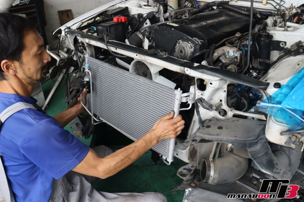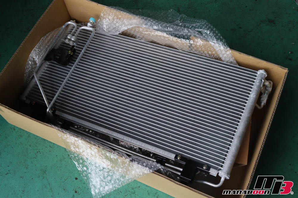 前回に引き続き、エアコン交換の作業を行います。コンデンサーを交換します。