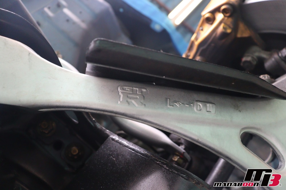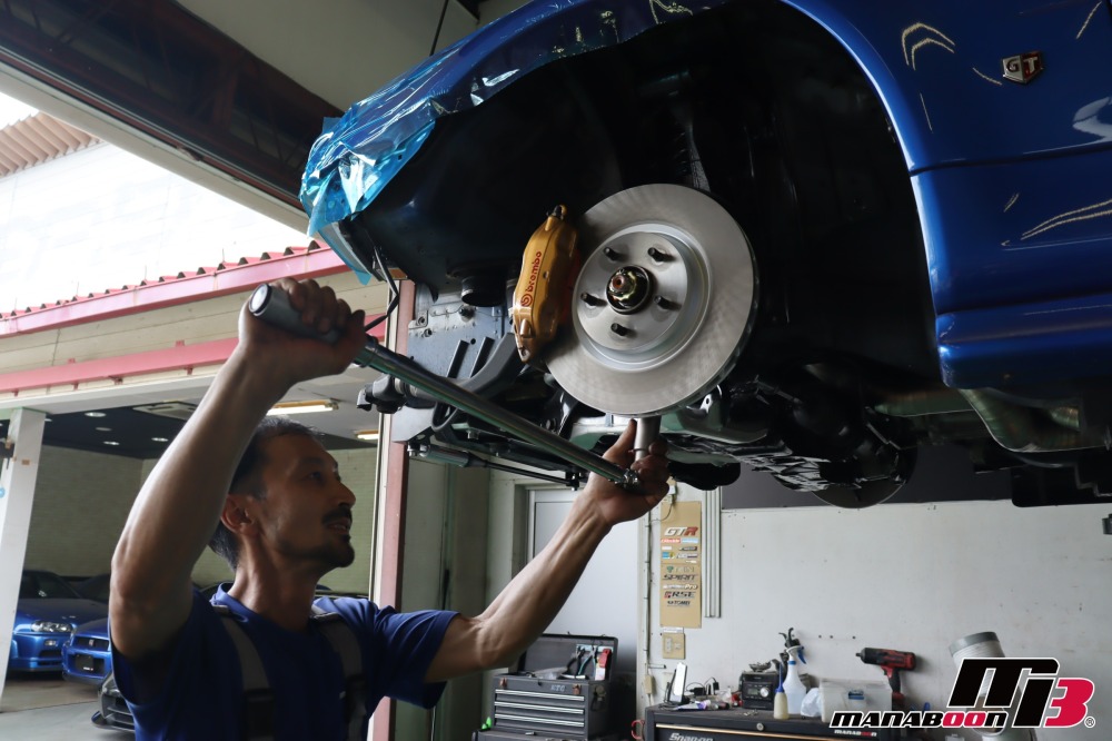 本日は、BNR34の足回り交換をします。フロントロアアームと、スタビライザーを外します。