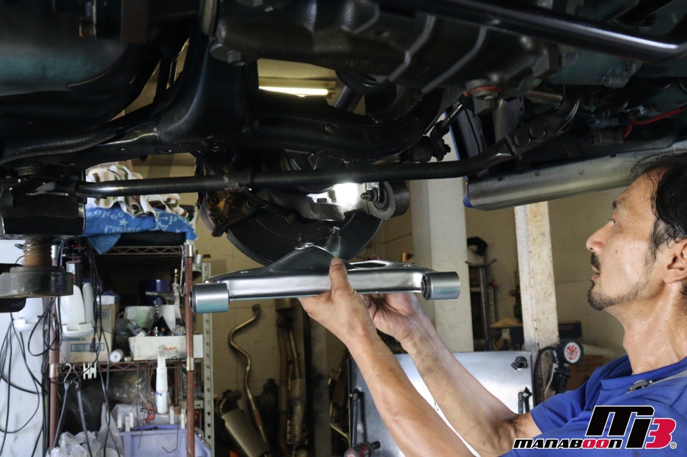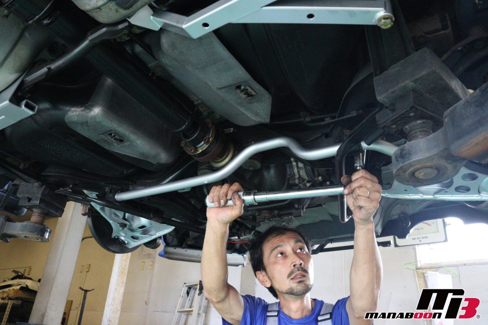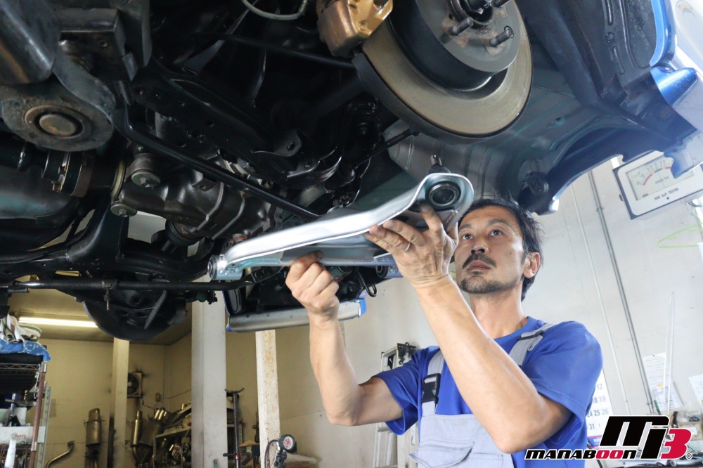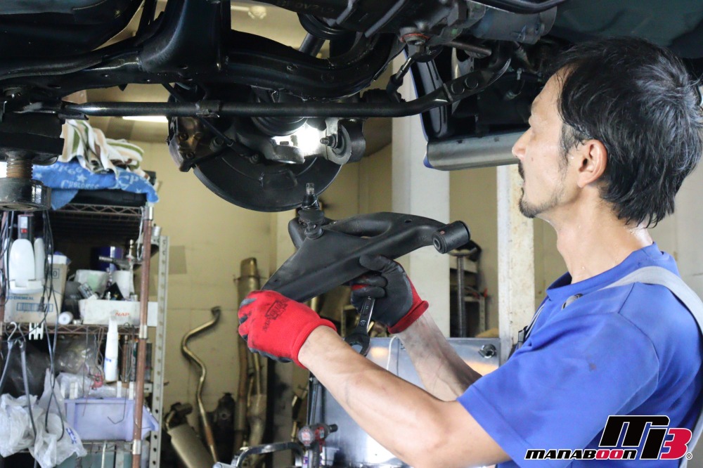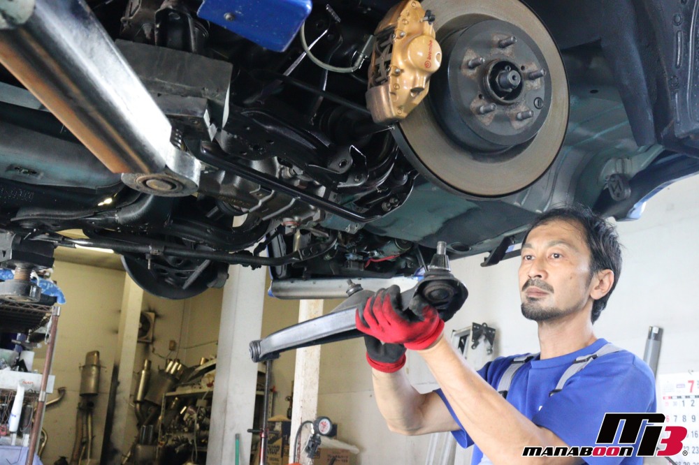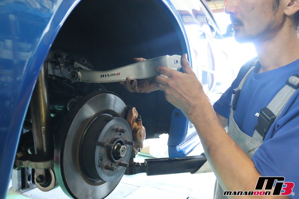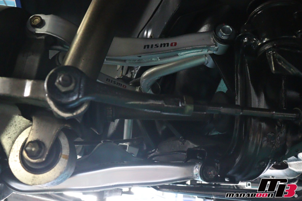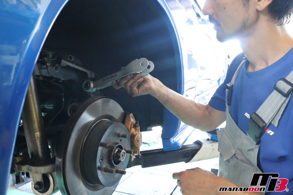 ニスモロアアーム・アッパーアームの交換、リアメンバーブレースの取り付けをします。