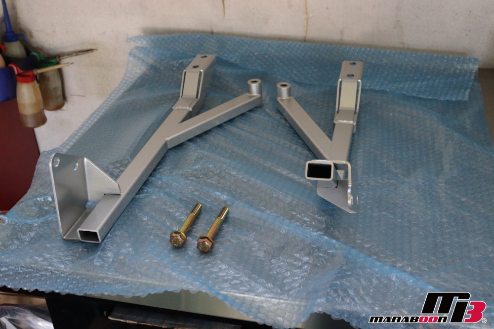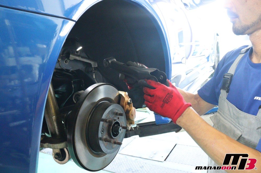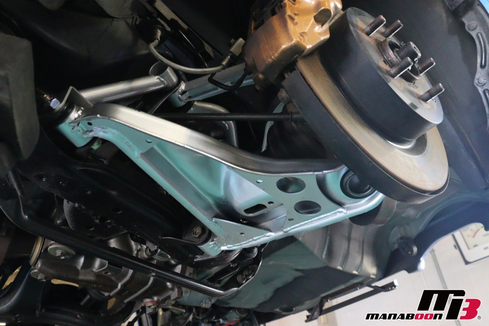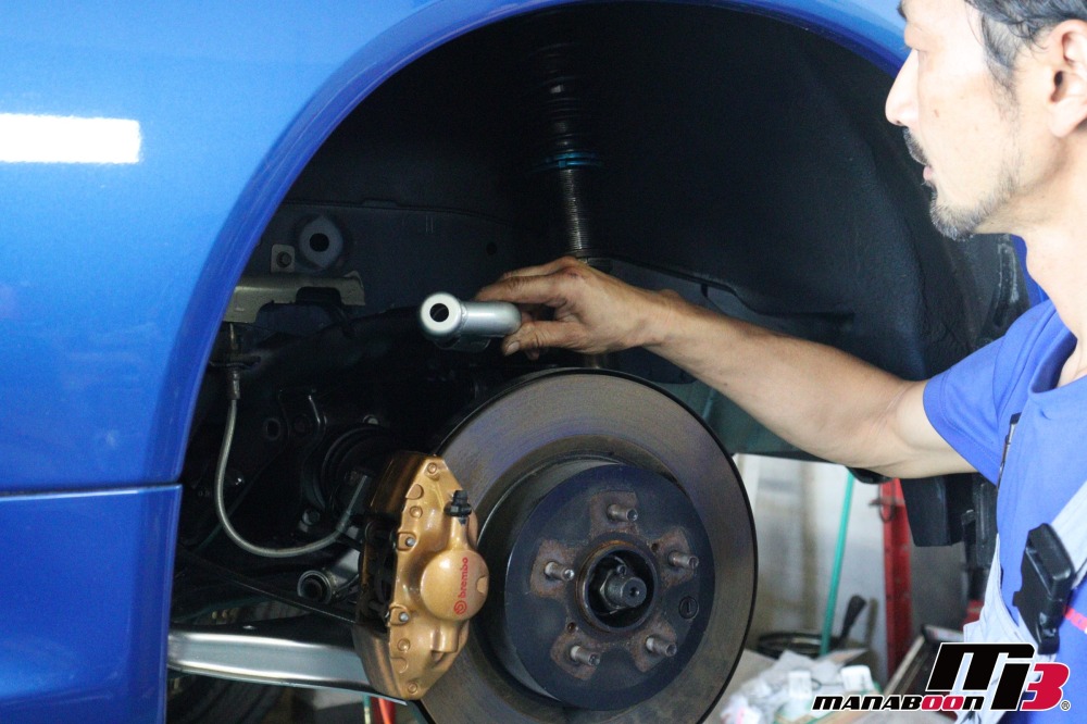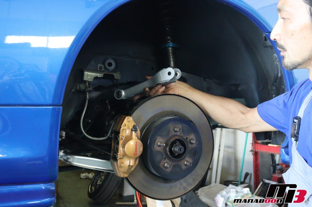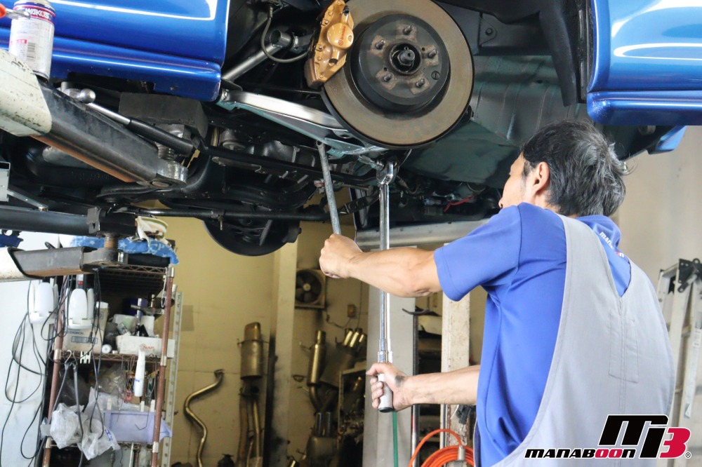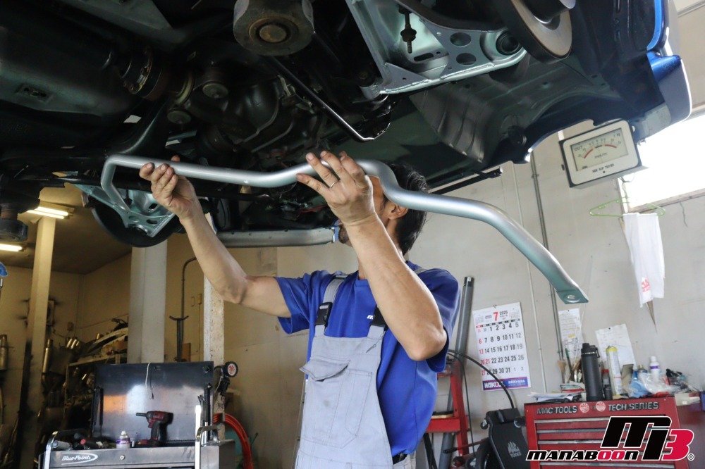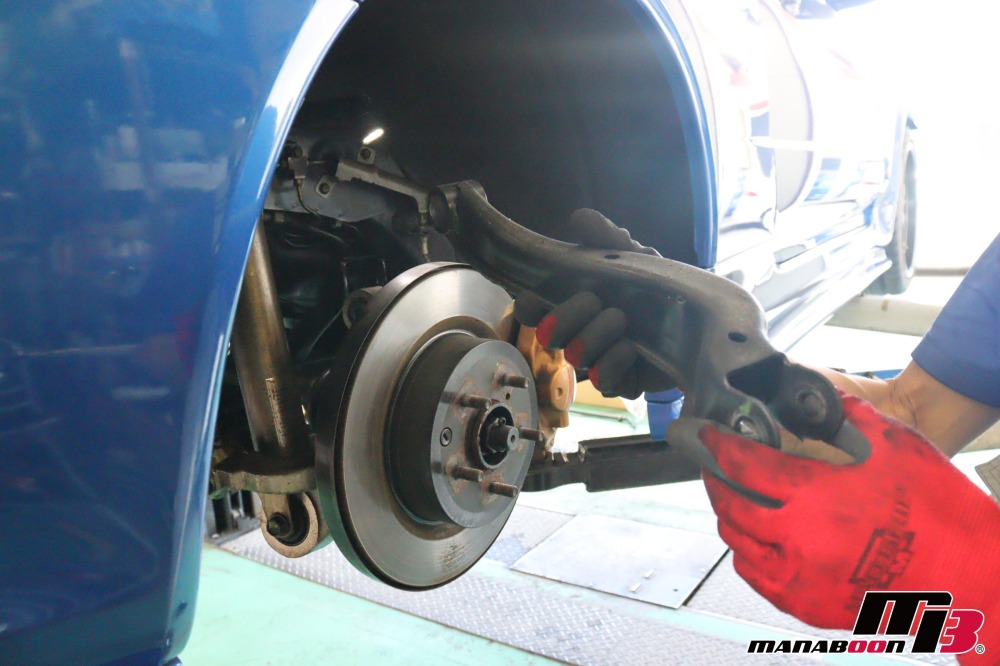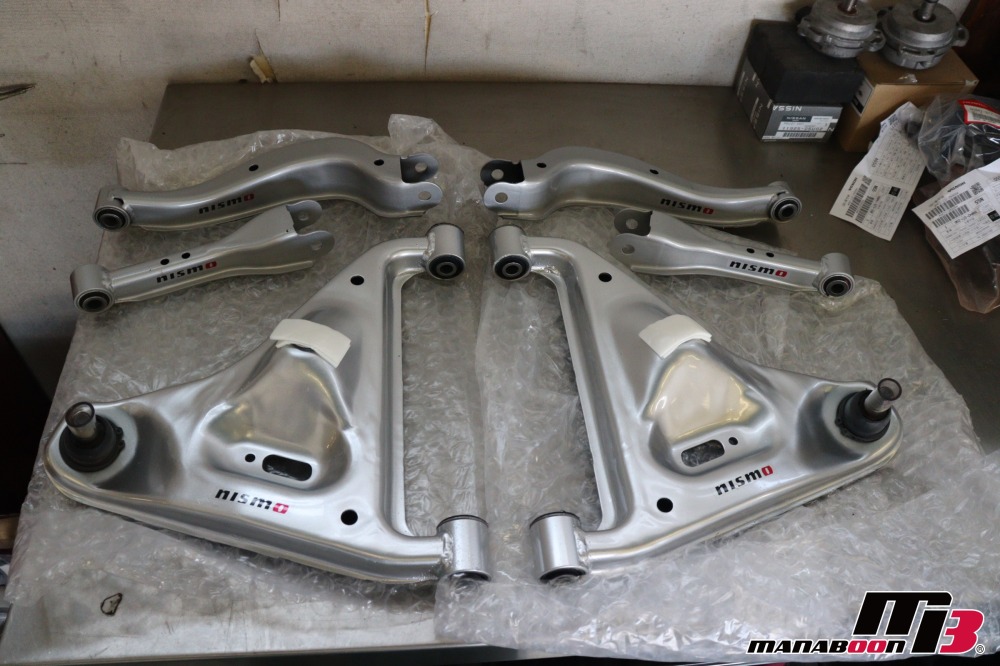 ニスモロアアーム・アッパーアームの交換、リアメンバーブレースの取り付けをします。