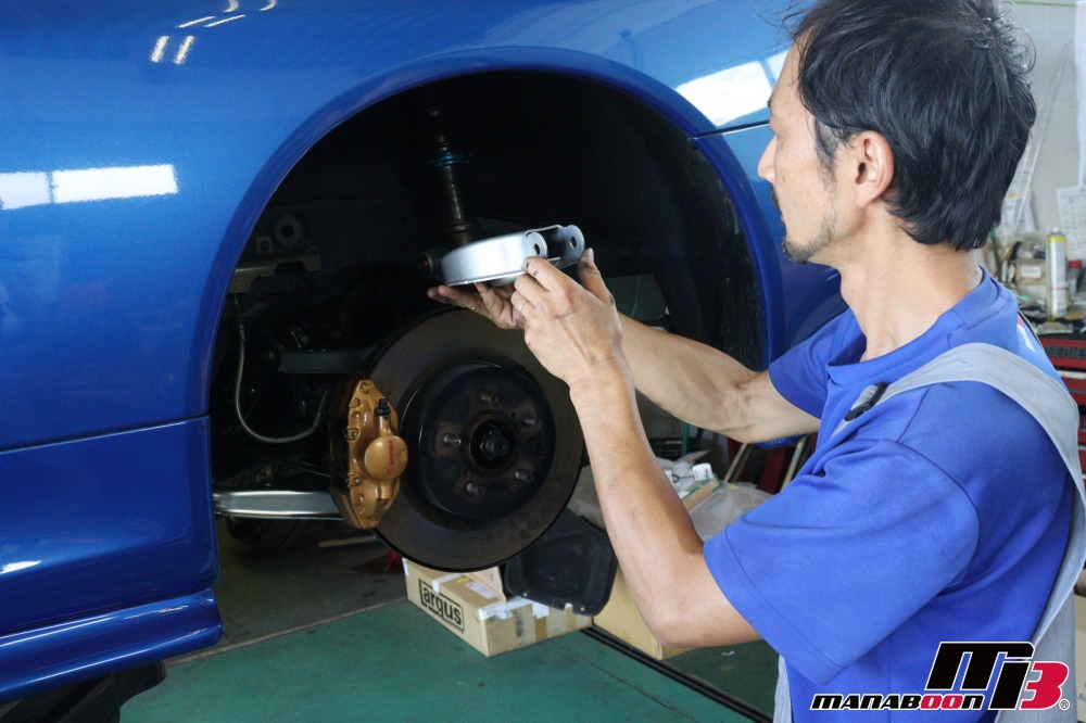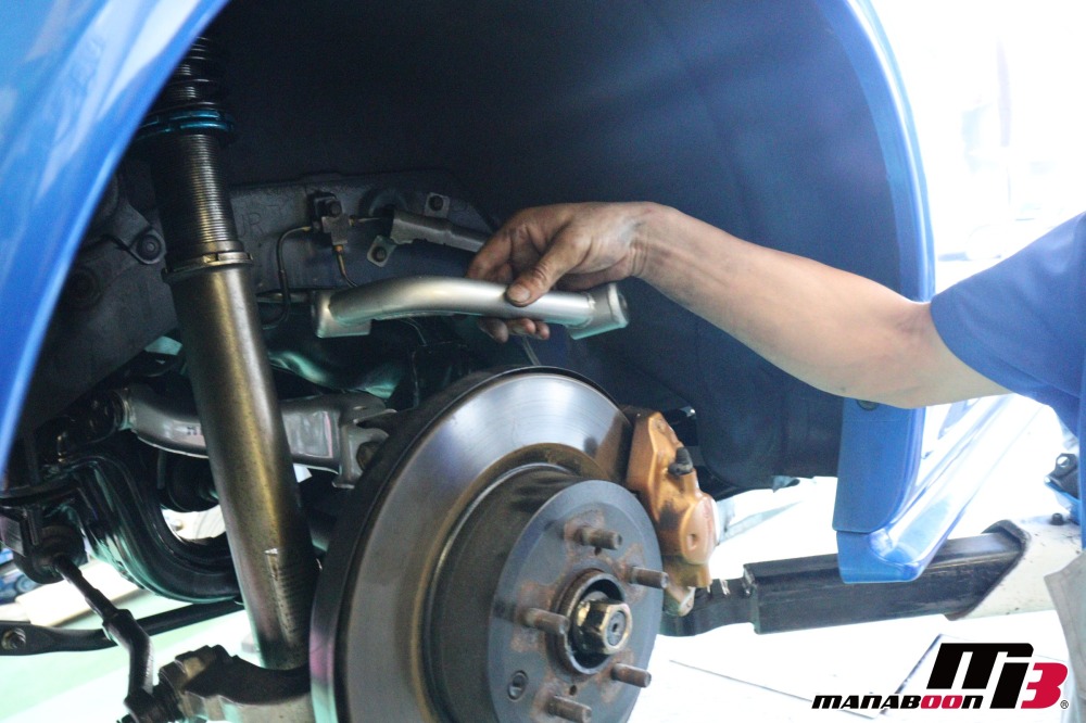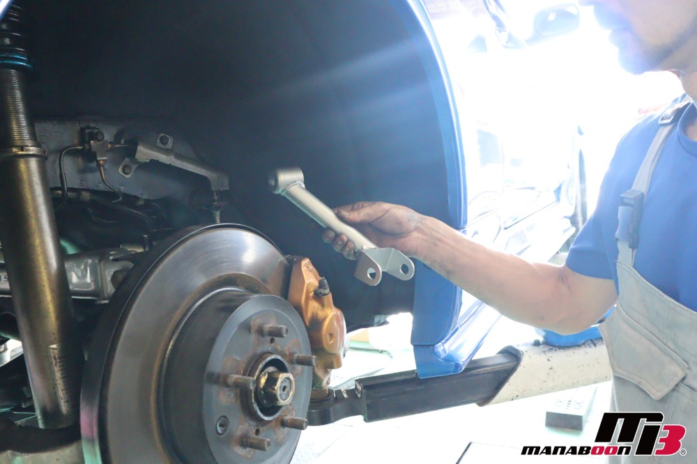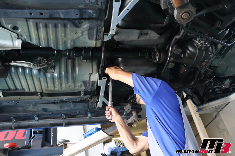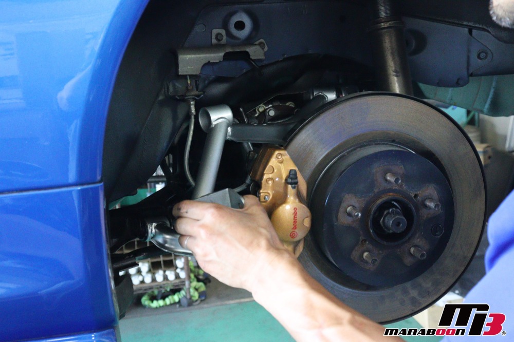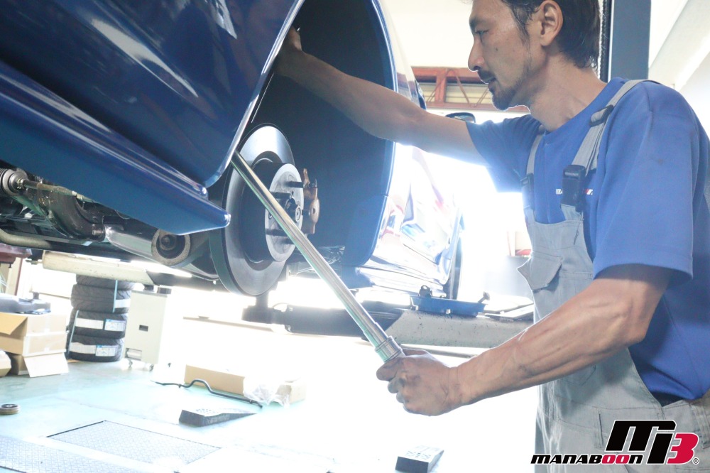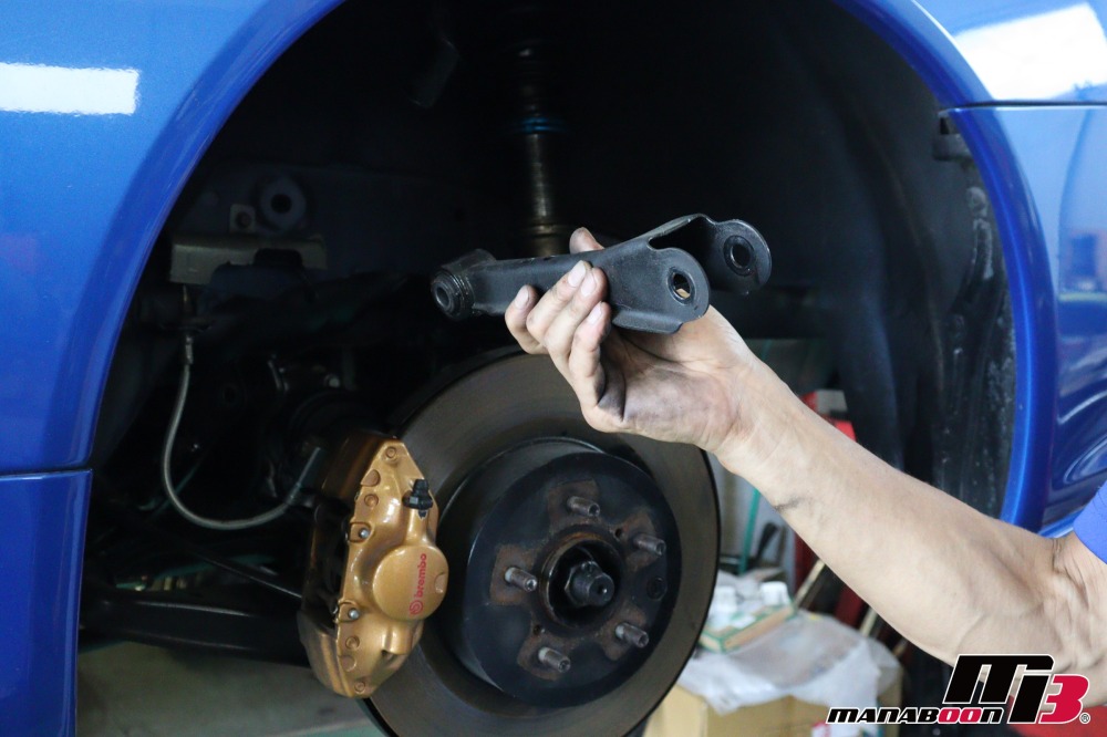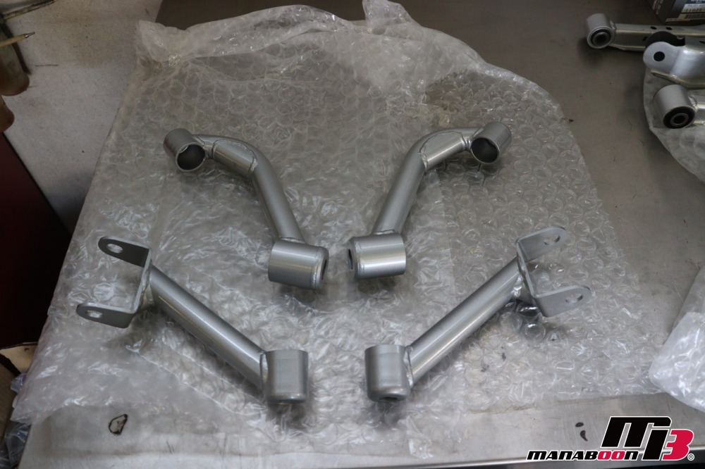 ニスモロアアーム・アッパーアームの交換、リアメンバーブレースの取り付けをします。