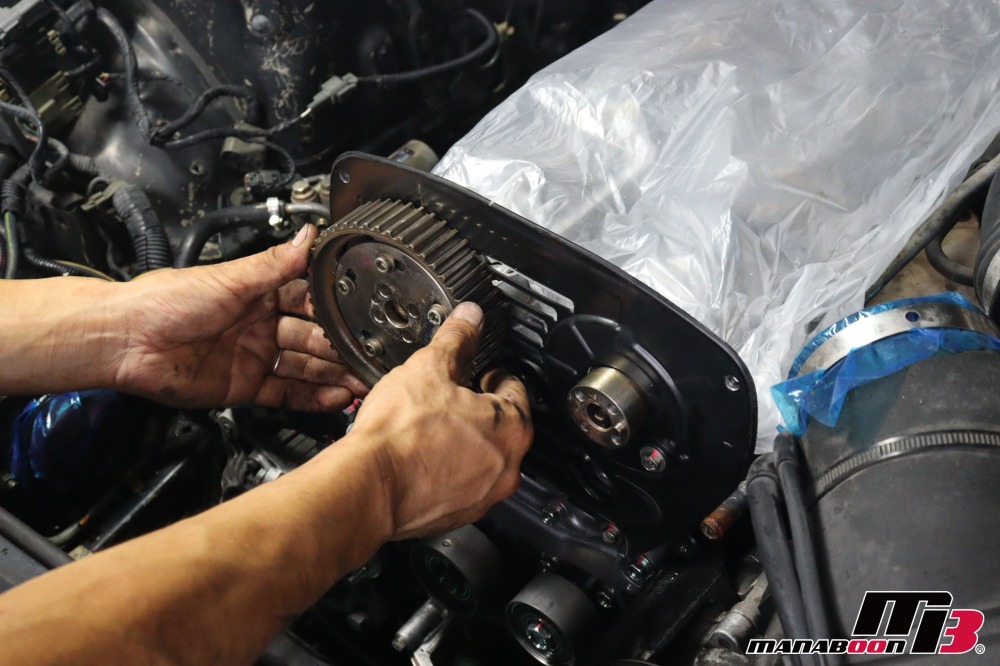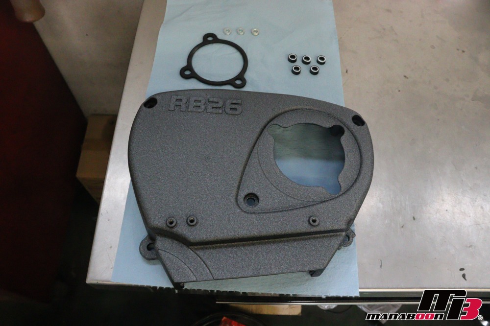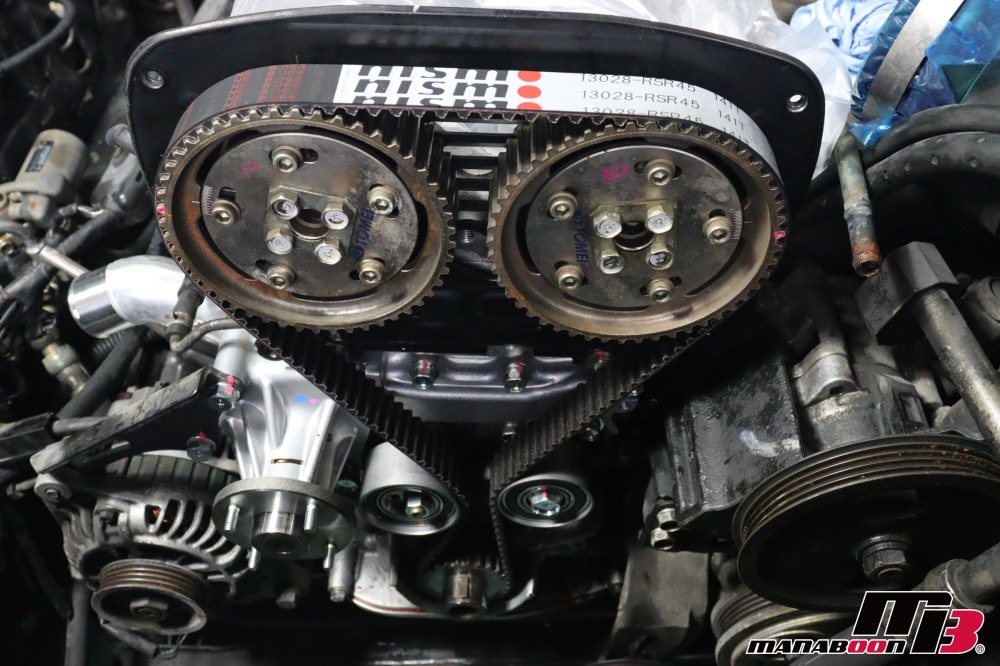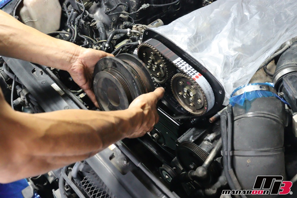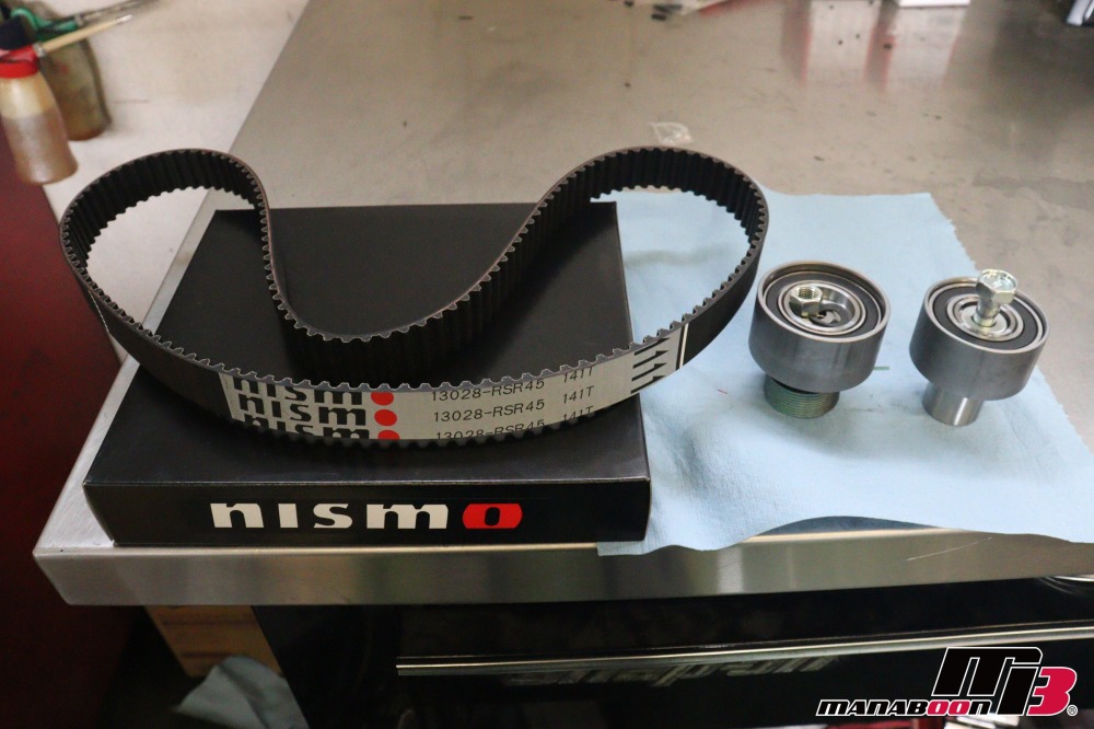 本日も引き続き、BNR32の作業を開始します。交換する、ニスモ強化タイミングベルト、プーリーです。