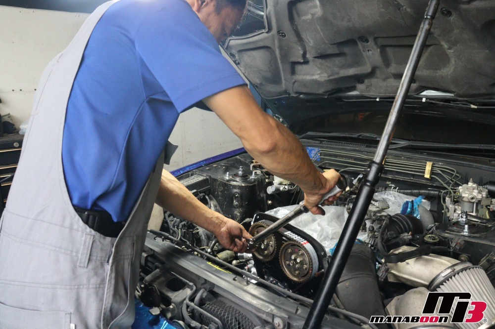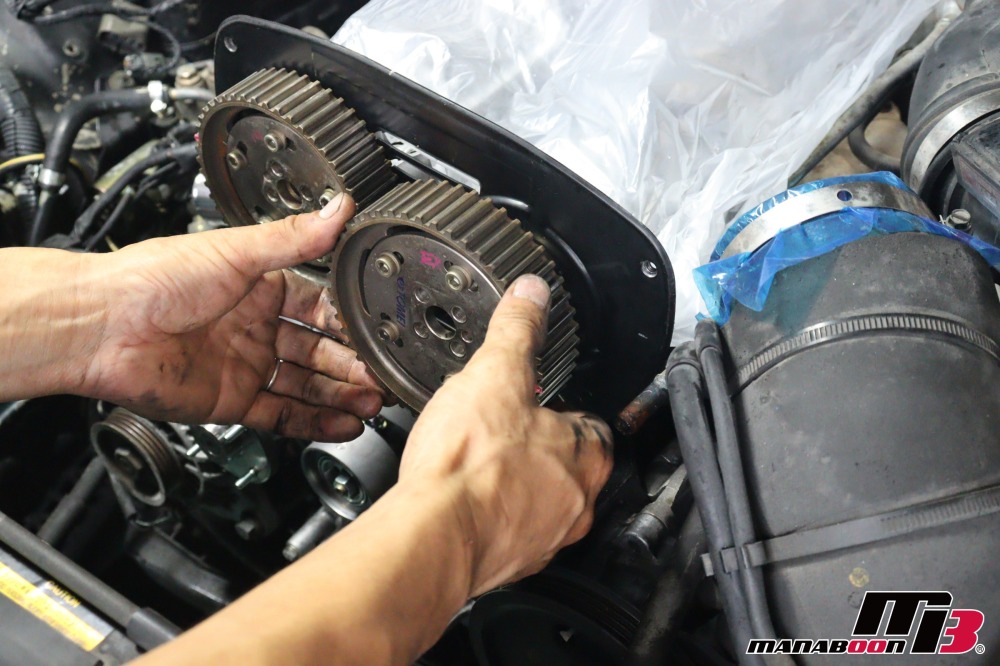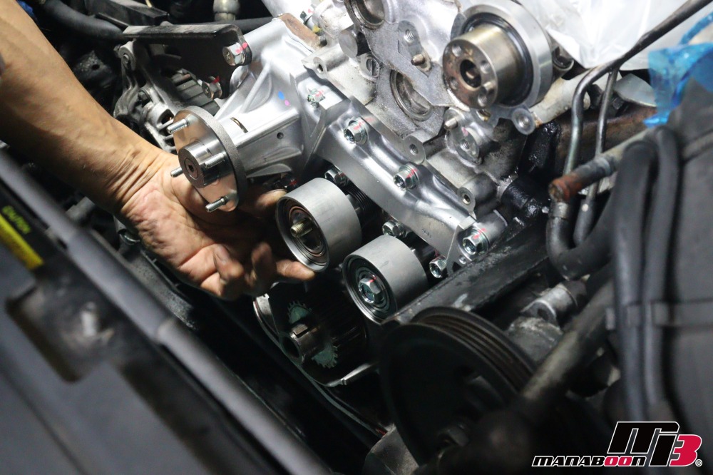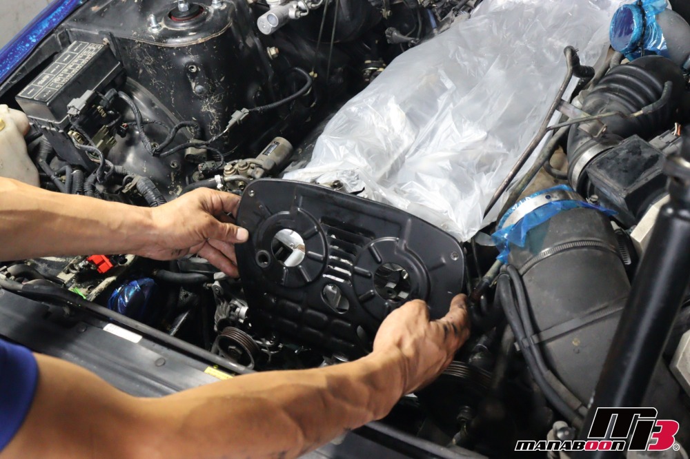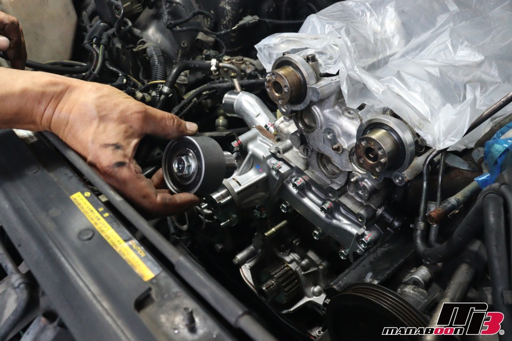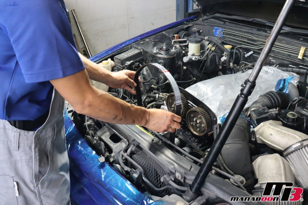 本日も引き続き、BNR32の作業を開始します。交換する、ニスモ強化タイミングベルト、プーリーです。