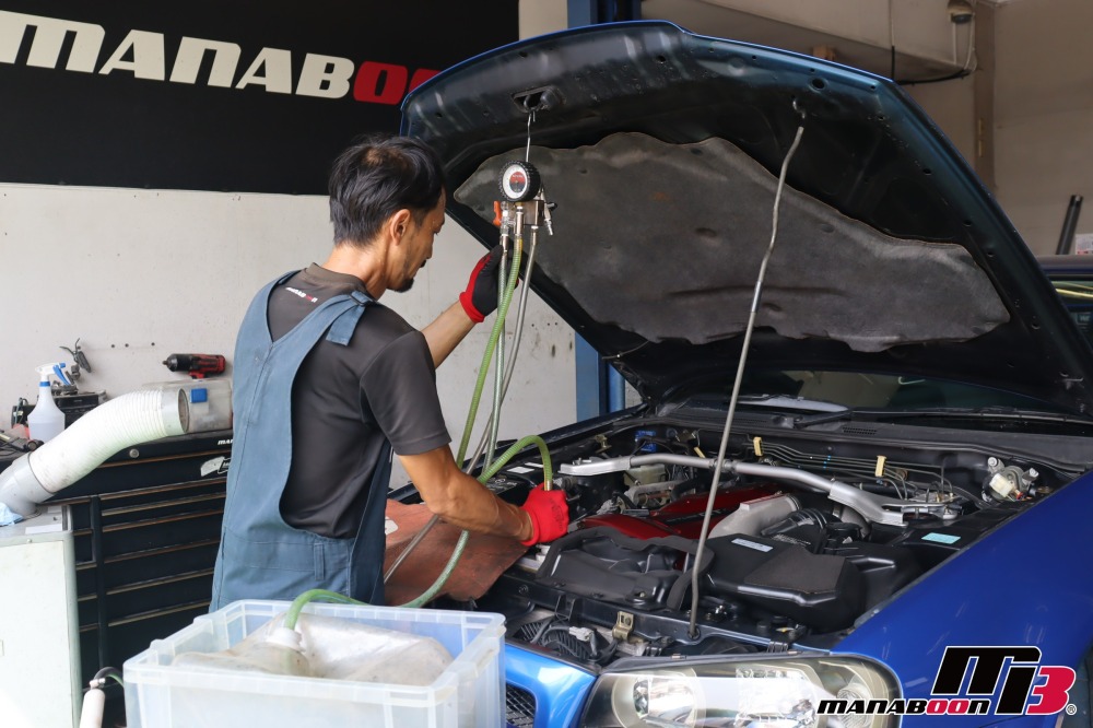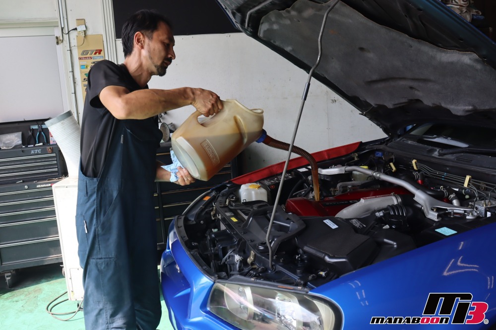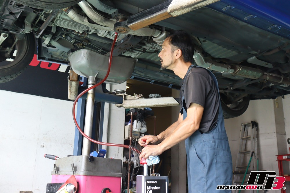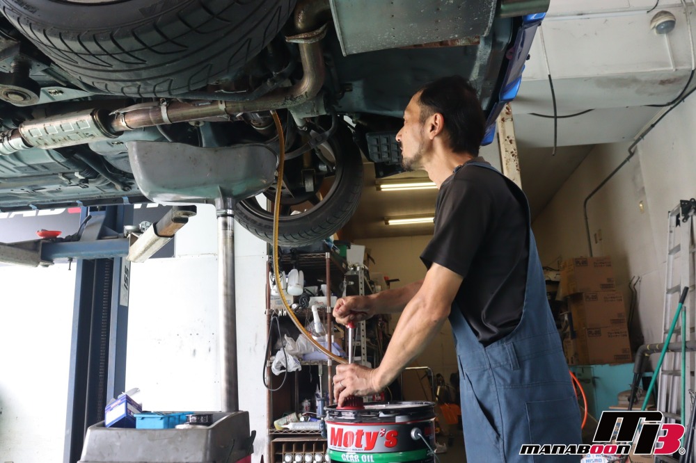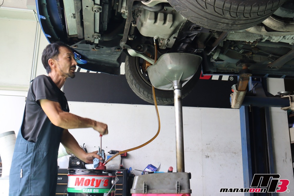 使用するオイルは、MOTY’S M407 85W-140です。 スカイラインGT-R BNR34 納車前点検画像 スカイラインGT-R BNR34 納車前点検画像 ミッションオイルを入れます。