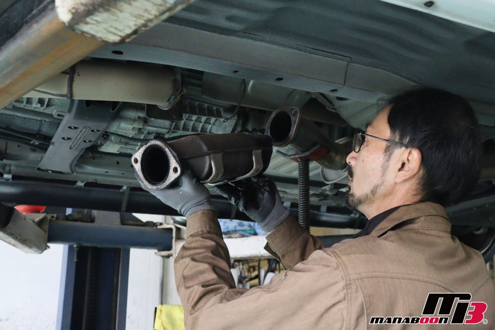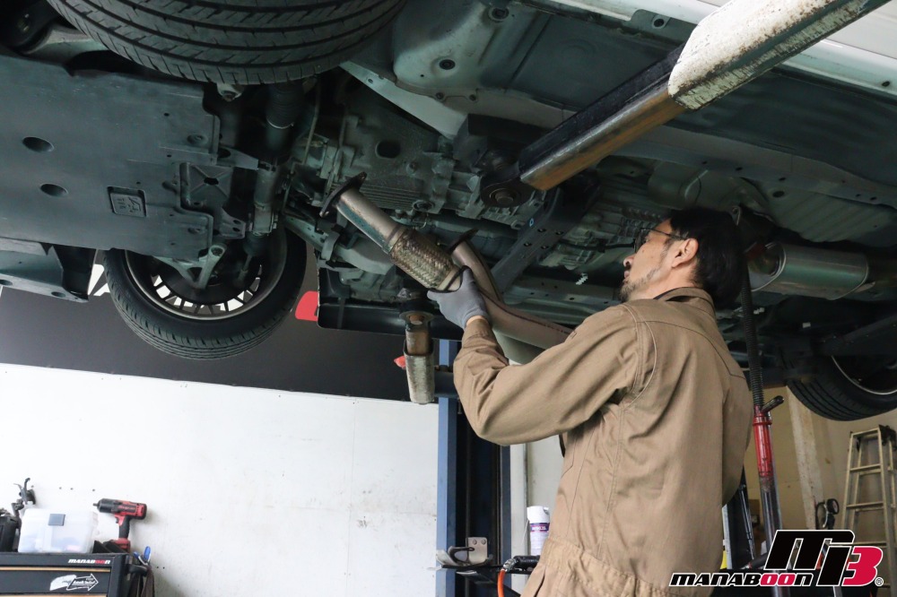 キャタライザーとフロントパイプを交換するので、外します。