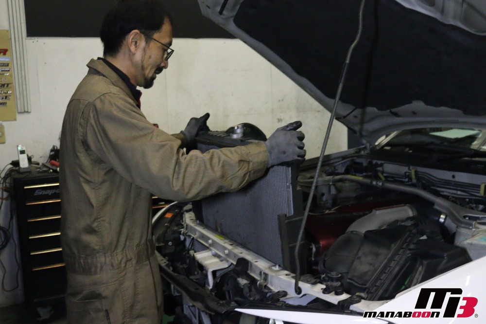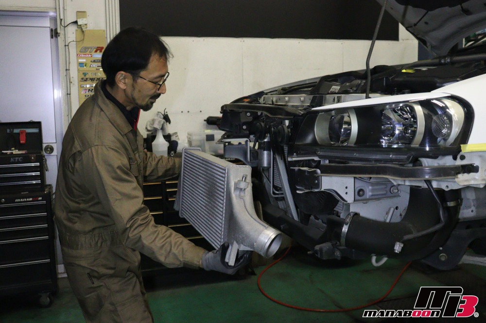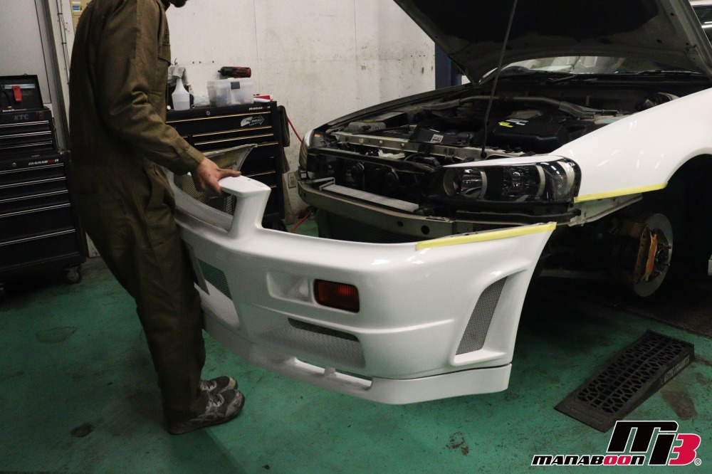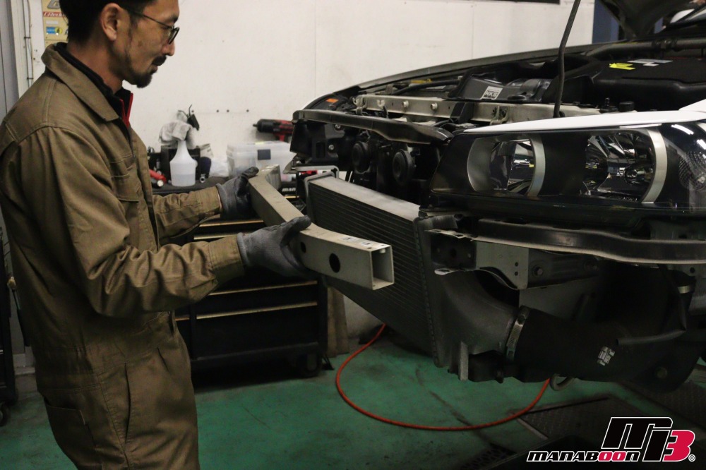 インタークーラー交換もあるので、フロントバンパーを外します。