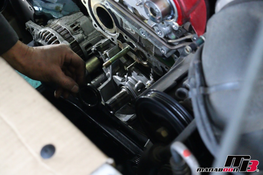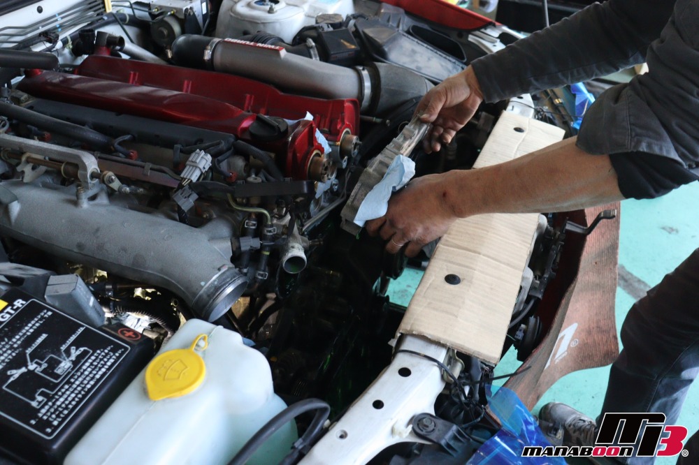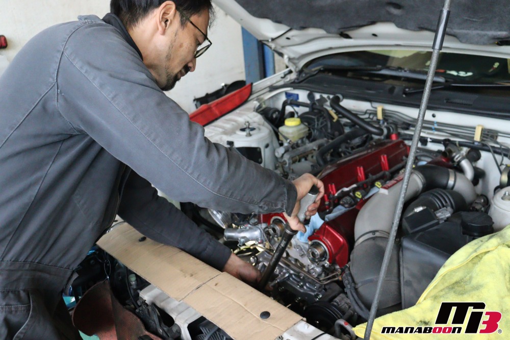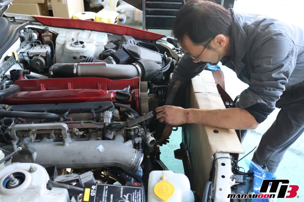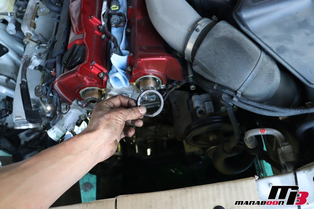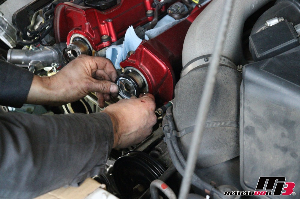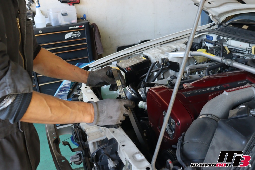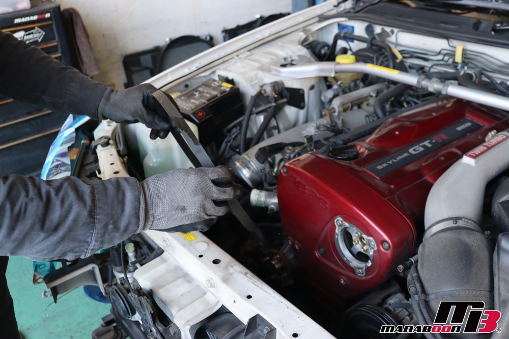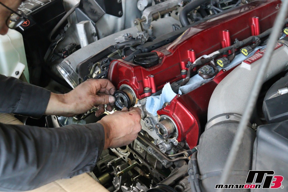 前回に続き、BNR34の整備をします。タイミングベルト交換です。