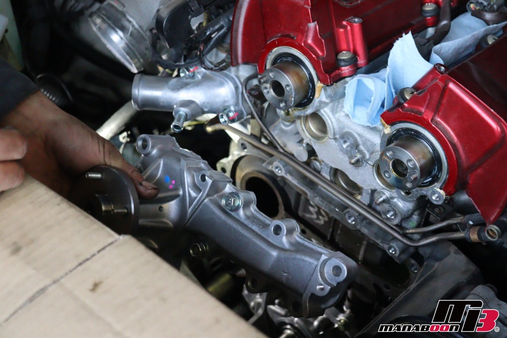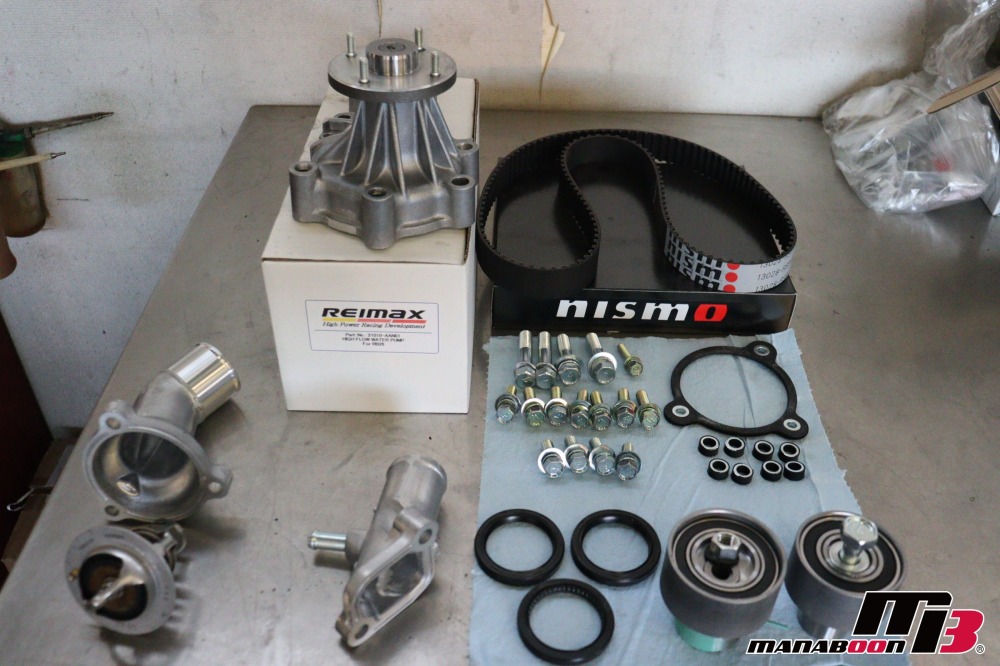 交換する、ニスモタイミングベルト、レイマックス ハイフローウォーターポンプ、プーリー、ダストカバー、シール類、サーモスタッド・ケース、アウトレットケースです。